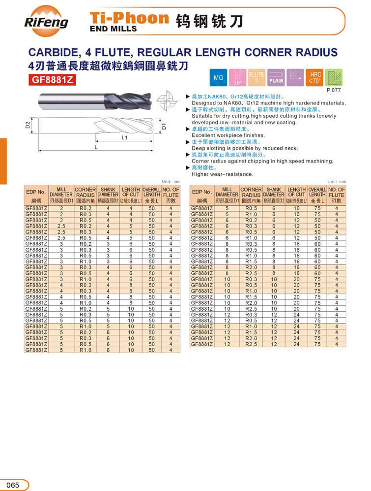 4刃超微粒圓鼻鎢鋼立銑刀065